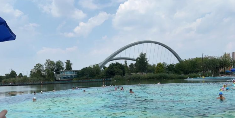 成都江滩公园无边泳池 都市无边界沙滩泳池3000平方米泳池面积 成都江滩公园无边泳池,是全川最大的都市无边界沙滩泳池,泳池面积约3000平方米,沙滩面积约600平方米