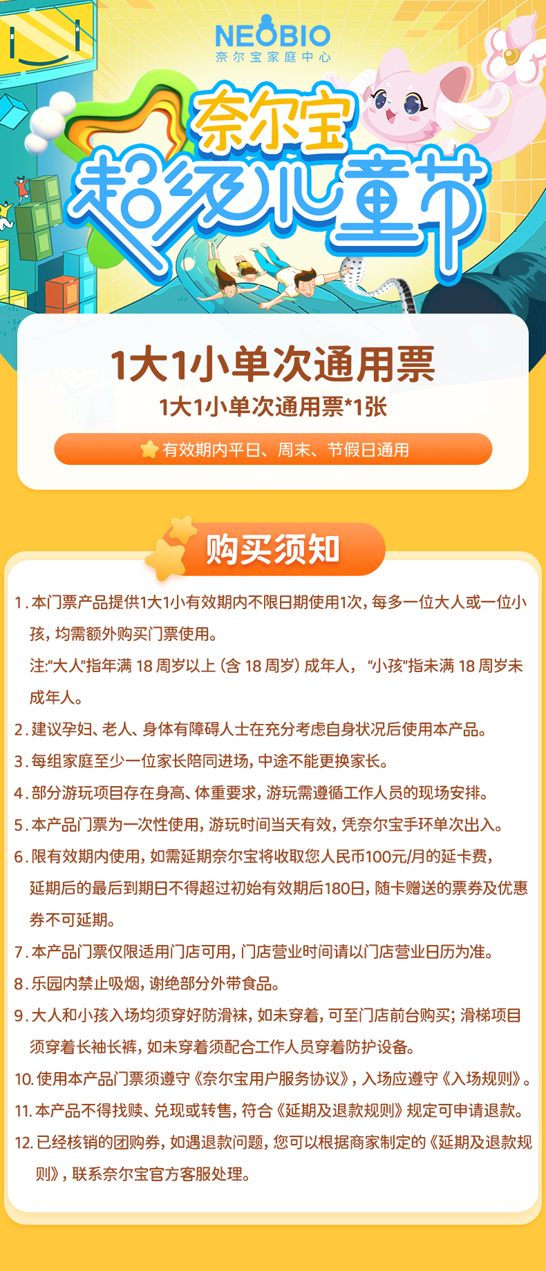 5.本产品门票为一次性使用,游玩时间当天有效,凭奈尔宝手环单次出入。